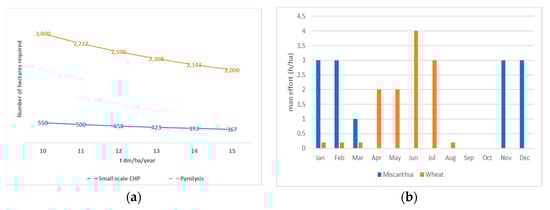 Perennial, non-food crops such as Miscanthus are considered a resource efficient option for south European countries since they are established once, have dense rooting systems, use low water and nutrient inputs and have high drought resistance. Perennial cropping reduces tillage and erosion risks [51,52] and increases soil carbon. It must also be stressed that selection of appropriate species and land types is case and region specific and must consider local ecology and ensure that biodiversity is carefully preserved, and any risks of an invasive species is avoided. Final selection of crops determines the annual management practices, transportation, storage, and overall system efficiency to year round raw material supplies that guarantee smooth operation.