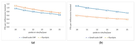 Total FTEs per million E;uro investment range from 4.1 to6.1 and from 7.3 to 11 for pyrolysis and small scale CHP respectively. For small scale CHP, estimated direct FTEs range from 0.6 for high crop yields (15 t dm/ha/y) to 1.0 for low crop yields (10 t dm/ha/y). For pyrolysis, the figures are very similar and are 0.7 and 1.1, respectively. For small CHP, the estimated indirect FTEs range from 7.3 for high crop yield to 11 for low crop yield. For pyrolysis, the figures are from 4.1 to 6.1 respectively. It is worth noting that direct FTEs are almost identical as they refer to the employment for cultivating the fields and harvesting while the significant differences in the estimated indirect FTEs include logistics, services and raw material purchase and in a way reflect the inefficiencies of small scale and low yields resulting in many more farms engaged for the provision of year round supplies in the refence value chains. As mentioned above, smaller scale value chains create more labour-intensive logistics operations.