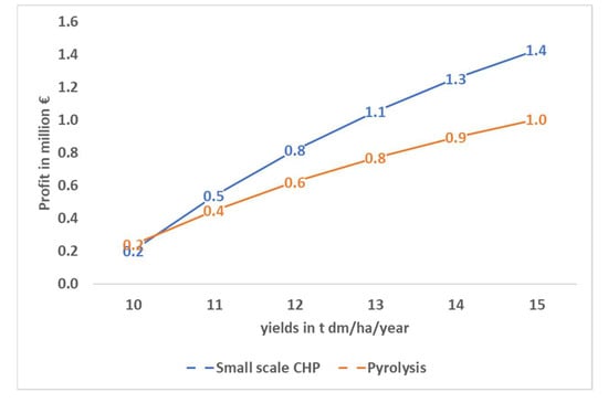 Total annual profit from feedstock production and handling for the small scale CHP value chain ranges from 38,000 € for low crop yield (10t dm/ha/y) to 268,000 € for high crop yield (15 t dm/ha/y). For pyrolysis, the figures are 373,800 € for low crop yield to 1,570,000 € for high crop yield. Table 7 summarises modelled estimated annual profit and details are provided in Appendix B.