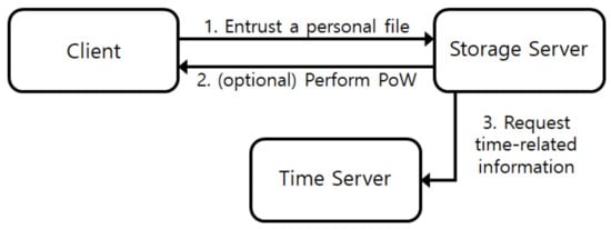 - Step 1. For each time t, publishes the time-related value . The time server can transmit time-related values to storage servers by various means; however, we consider the case where the time server publishes the information on a bulletin board. Then, at time t, may publish on its bulletin board.