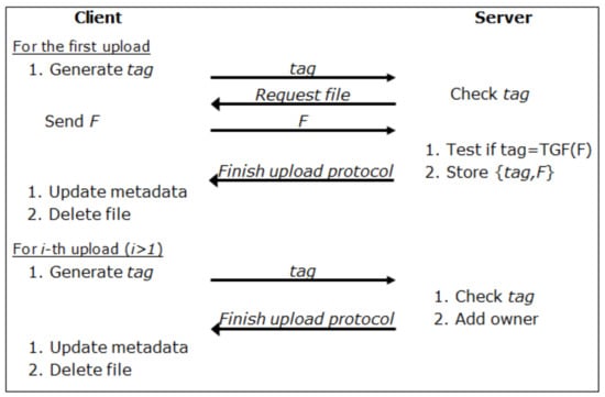 Before discussing the privacy leakage in client-side deduplication in detail, let us recall that a checking step exists. When a user initiates a protocol execution to upload a ciphertext C, he/she evaluates a tag from the file and gives the tag to the service provider. Here, the tag is used for identifying a specific ciphertext C, and, thus, a hash value of the file is generally used as a tag because of the collision resistance of the underlying hash function.