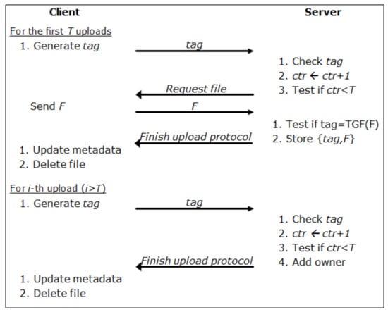 As can be seen in Figure 3, in the naive client-side deduplication, a client can finish an upload protocol execution without actually transmitting his/her file when the same file is already maintained by the server. Therefore, except for the first user who should actually transmit his/her file, we can reduce the cost of communication by eliminating the data transmission step. In the counter-based scheme, as seen in Figure 4, the server chooses a random threshold so that the functionality of client-side deduplication is disabled until the counter is increased by one for each upload request and it is less than the predefined random threshold. One merit of the counter-based approach is the efficiency of the functionality because the only additional procedure is to set a threshold and to maintain a counter for a file. However, the scheme is not designed to support encrypted data and, therefore, we cannot use it for encrypted data. To be sure, we can modify it to support encrypted data by using one of the message-locked encryption techniques. However, the scheme cannot support client-side deduplication for encrypted data in the current form. In terms of the security against identification attacks, the scheme is secure if the storage server willingly consumes its resource because a large counter may guarantee a higher level of security than a small one. For example, if a curious server uses a considerably small number or a fixed number for the threshold, we cannot expect sufficient security. Because a storage server is regarded as an honest but curious adversary, we need a way to force the server to support sufficient security against identification attacks. In Figure 5, we illustrate the proposed technique. Because we already provided a detailed explanation for it in Section 3, we have not provided any further explanation for the figure. Unlike the two other schemes, the proposed scheme supports encrypted data for deduplication, and, thus, there is a step for encryption in Figure 5.
