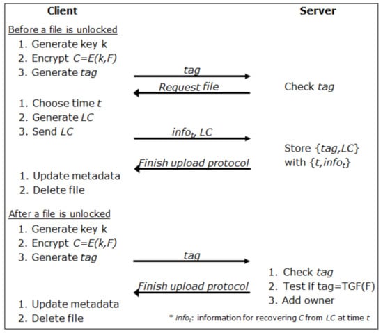 - Step 3. If Clt receives N/A from Srv, the client chooses a random r and a time t, and computes , , and . Then, he/she generates a locked ciphertext aswhere . Then, the client uploads the time-locked informationto the server and deletes the file F from his/her storage; otherwise, Clt deletes the file F without uploading it.