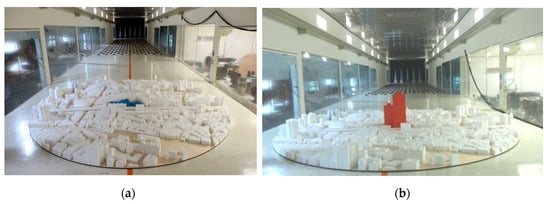 In this study, wind-tunnel tests were performed based on an actual urban renewal project. An 800-m-diameter urban street area was investigated, including the urban renewal area and the surrounding existing buildings. A wind-tunnel test model with a 3.2 m diameter was generated at a scale of 1/250. The pre-urban renewal original buildings are approximately 10 m in height and classified as low-rise buildings (the blue regions in Figure 1a). During urban renewal, these buildings will be demolished, and high-rise buildings approximately 90 m in height will be constructed at the same site (the red regions in Figure 1b).