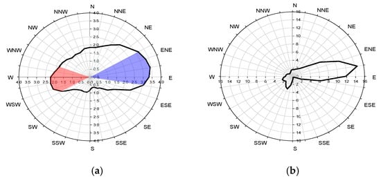 Wind speed and wind direction data acquired at meteorological stations near the urban renewal site for 2003–2013. (a) Mean wind speed for various wind directions; (b) after urban renewal probability of each wind direction.