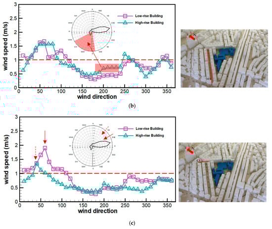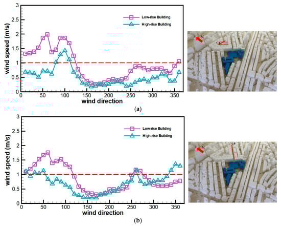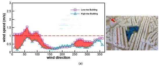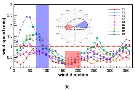 Figure 7a shows the changes in the pedestrian-level wind speeds in C7. Before urban renewal, the maximum wind speed is approximately 1.6 m/s. Wind speeds above 1 m/s are found at 10°–120°. The mean wind speed in all other directions is below 1 m/s. The street canyon C7 is near elevated highways. There is a complex wind flow field after the construction of new buildings for urban renewal. As a result, there are two peak wind speeds at 30°–100° after urban renewal. The maximum wind speed (1.6 m/s) after urban renewal is close to that before urban renewal.