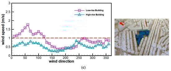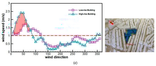Figure 6c shows the changes in the pedestrian-level wind speeds in C6. Before urban renewal, the wind speeds for 10°–120° winds are above the comfort level (1 m/s), with a maximum wind speed of approximately 1.8 m/s. The wind speeds in other directions are below 1 m/s. The minimum wind speed (0.3 m/s) occurs at 200°. However, after the construction of new high-rise buildings for urban renewal, the wind speeds in all the directions are below 1 m/s. The maximum and minimum wind speeds are 0.9 and 0.2 m/s, respectively.