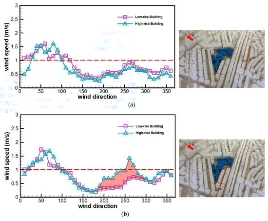 The effects of urban renewal on the pedestrian wind environments in the street canyons are discussed here. In Figure 5, Figure 6 and Figure 7, the purple squares and light green triangles show the pre- and post-urban renewal pedestrian-level wind speeds in the street canyons, respectively.