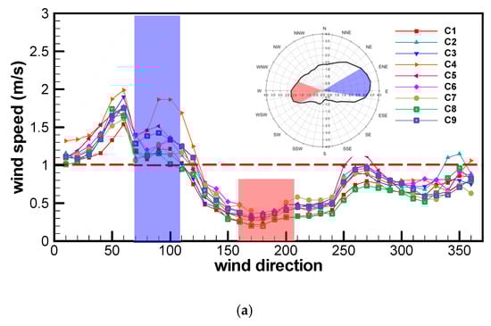 A comprehensive analysis of the changes in the pedestrian-level wind fields in the street canyons after urban renewal is presented here. Figure 8a shows the characteristics of wind speeds in various directions in C1–C9 before urban renewal. Before urban renewal, the wind field trend is relatively consistent in each street canyon. Comfortable wind fields can be found at approximately 10°–120° in all the street canyons. The wind speeds are below 1 m/s in all other directions except for one or two street canyons.