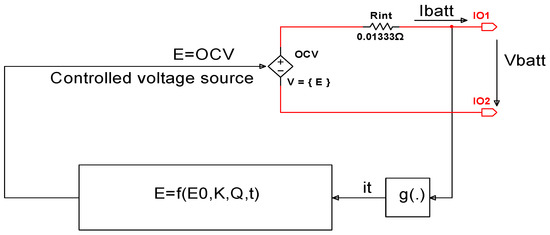 In this schematic the battery is modeled by a controlled voltage source E, which is a no-load voltage (open circuit voltage (OCV)) [25], given by: