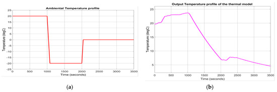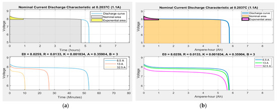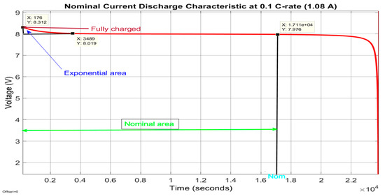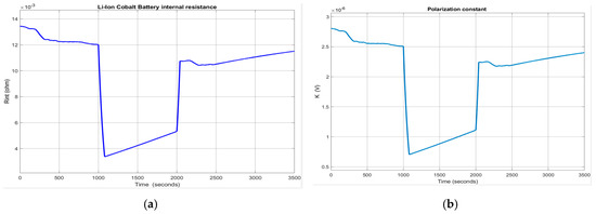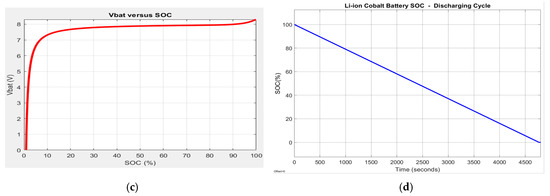 A full representation of the generic battery model, dependent on the temperature and aging effects, is developed in MathWorks (Natick, MA, USA; www.mathworks.com) in the MATLAB R2019b/Simulink/Simscape/Power Systems/Extra Sources Library-Documentation. The MATLAB Simscape Li-ion cobalt battery cell specifications are shown in Table 2.