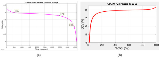 - Open-circuit voltage (OCV) method. This method uses “the stable electromotive force (EMF) of the open circuit” and the SOC relationship to “estimate the SOC value”, as is stated in [17]. In [10] are presented in detail some reasons why this method is inadequate for the dynamic estimation of the Li-ion battery SOC. Moreover, since its OCV = f (SOC) characteristic is almost flat for a considerably broad range of SOC values, it isn’t easy in this approach to estimate SOC more accurately [18].