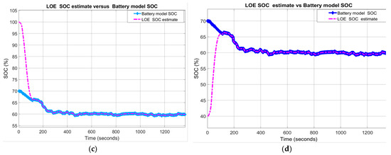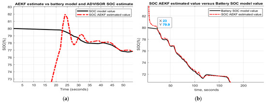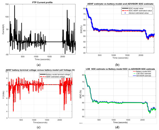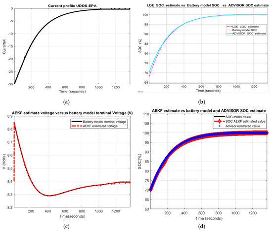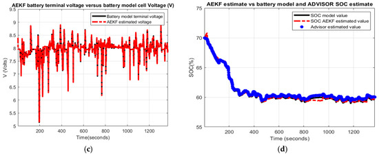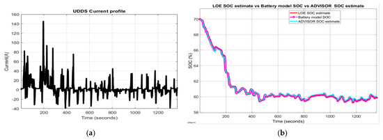 Although, if the dynamics of Li-ion battery model are “highly nonlinear”, “linearization error may occur due to the lack of accuracy in the first-order Taylor series expansion under a highly non-linear conditions” [17]. The simplicity of the SOC EKF estimator design and implementation motivates researchers to apply this estimation technique for different Li-ion battery models, as in [4,7,8,9,11,16,17,18,19,20,21,22,23,24]. In [16] an exciting research project that performs a detailed and rigorous analysis of state of the art on Li-ion BMSs, including also a detailed presentation of the main SOC estimation techniques, among them the adaptive Kalman filtering techniques, is presented. Similarly, [17] presents an intense study of state of the art on Li-ion battery SOC estimation for electric vehicles that completely reviews of all the existing SOC direct measurement and estimation techniques reported in the field literature. Similarly, in [18] a brief review describing the SOC estimating methods for the same Li-based batteries is provided. In [19], the authors proposed a dual EKF for state and parameter estimation for a first-order EMC RC Li-ion battery model. The SOC simulation results reveal an excellent accuracy of the SOC estimate, but the robustness algorithm robustness is not investigated. Comparing the SOC simulation results obtained in current research work and in [19], one can observe an excellent accuracy, and the robustness of the algorithm developed in our research for several scenarios. In [20], the authors use an improved non-linear second-order RC EMC battery model and based on this model have developed an EKF algorithm to estimate the Li-ion battery SOC. The simulations are conducted on the MATLAB platform using two different driving cycles current profiles, namely Urban Dynamometer Driving Schedule (UDDS) and HWFET. The results are compared to those obtained by a Coulomb counting method and reveal an excellent SOC accuracy, but degradation is visible in the robustness performance to changes of battery model parameters values provided by two datasets, compared to the SOC estimator robustness performance designed in our research, for many scenarios introduced in Section 3. In [21] is developed a new application “model-based fault diagnosis scheme to detect and isolate the faults (FDDI) of the current and voltage sensors applied in the series battery pack based on an adaptive extended Kalman filter (AEKF)”. The AEKF algorithm is designed to estimate the magnitude of the faults. The FDDI scheme is validated in the MATLAB/Simulink platform, and the result of the simulations demonstrates the “effectiveness” of the proposed FDDI for “various fault scenarios using the “real-world driving cycles”.