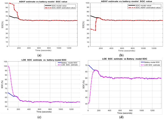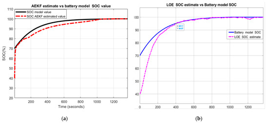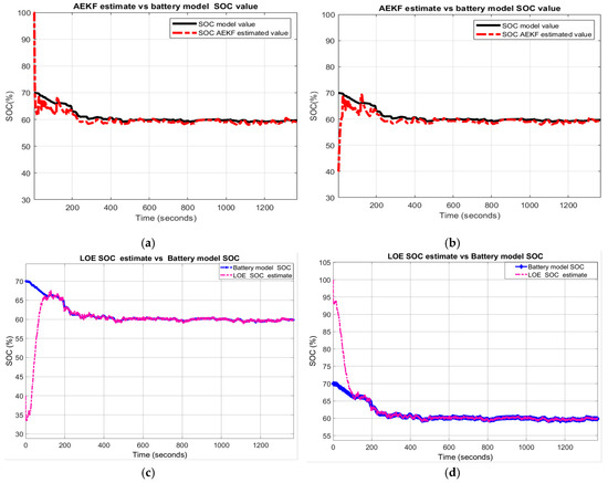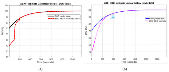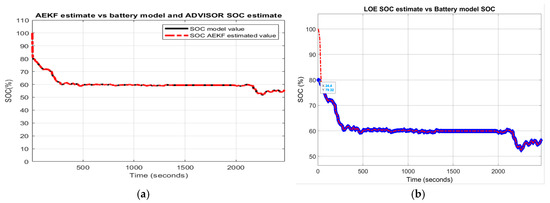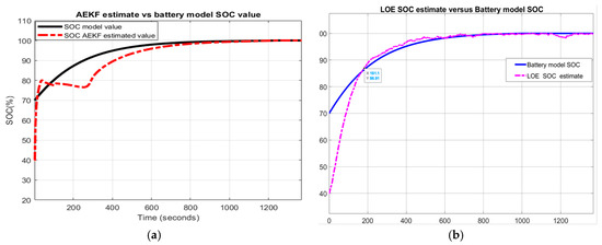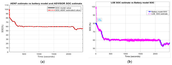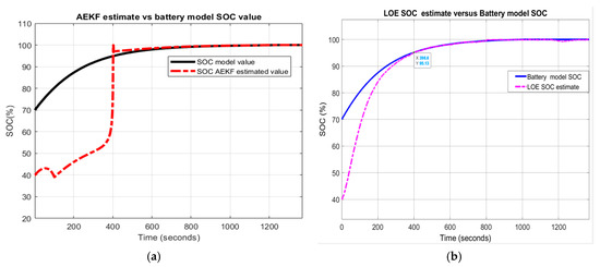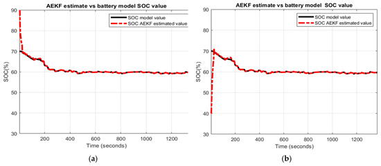 Robustness of AEKF and LOE SOC estimators for R4-scenario; (a) AEKF SOC for R42; (b) LOE SOC for R42.