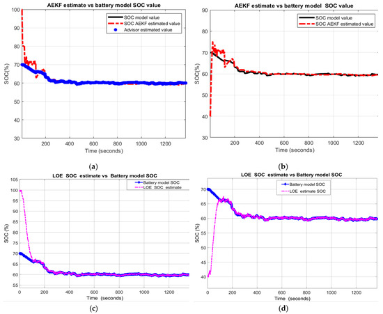 The adaptive filter estimators improve the “accuracy and the robustness of the battery SOC estimation significantly and reduce” drastically the impact of measurement and process noises on the battery model [17], such those developed in [7,8,9,10,11,12,14,18]. Among the Kalman filtering estimation techniques in the field literature the Kalman filter [KF], extended Kalman filter (EKF) [4,7,8,9,11,17,18], adaptive Kalman filter (AEKF) [17], fading Kalman filter (FKF) [17], unscented Kalman filter (UKF) [12,14,18], sigma-point Kalman filter (SPKF) [17] and particle filter (PF) are reported [17].
