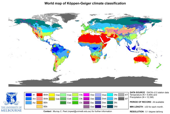 - Peel, M.C.; Finlayson, B.L.; McMahon, T.A. Updated world map of the Koppen-Geiger climate classification. Hydrol. Earth Syst. Sci. 2007, 11, 1633–1644. [Google Scholar] [CrossRef]