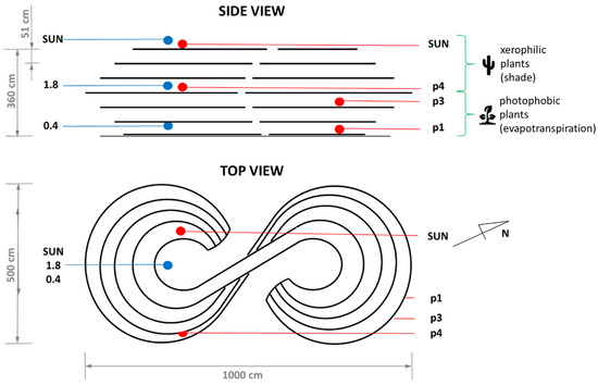 The first GS based on the above idea is in the city center of Wrocław, Poland, geographical coordinates: 51°07′26″ N–17°03′01.0″ E, and is called The Infinite Green [57]. The structure with the dimensions of 1000 × 360 × 500 cm and the distance between shelves of about 51 cm, was completed in August 2015 (Figure 3, Figure 4 and Figure 5). It was designed in the framework of the visual arts program for the European Capital of Culture in Wroclaw 2016. Originally the project had no scientific ambitions, and was only a cultural endeavor, and was created according to an artistic vision. Thus, in comparison to the primary concept, The Infinite Green shape is more complex (the symbol of infinity). It should also be mentioned that the summer climate in Wrocław is described as Dfa class, according to Köppen [56], so more moderate then B and Cs classes. Additionally, the solar altitude angle and sunshine time are different from the location, where the GS would be most desirable (Figure 1).