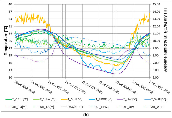 Results of the first temperature and humidity measurements (Period A): 26th/27th August 2016 (12:00–12:00): (a) temperature (T) and relative humidity (RH); (b) temperature and absolute humidity (AH). Abbreviations: 0.4—inside of the structure, 40 cm over the ground; 1.8—inside of the structure, 180 cm over the ground; SUN—top shelf (Figure 5); EPWR—measurements at Wrocław Airport; UW—measurements provided by the Observatory of the Department of Climatology and Atmosphere Protection, University of Wroclaw; WRF—results of simulation of weather conditions using WRF model. DAY/NIGHT lines mark the sunrise and sunset.