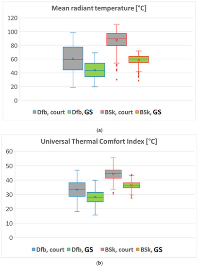 The results of the simulation are presented in Figure 9. The reduction of Tmrt and UTCI by the GS application is evident. Taking into account the average values, Tmrt decrease was 17 °C in the cooler (Dfb), and 29 °C in the warmer (BSk) simulated climate, what was followed by a decrease of UTCI by 5 °C and 8 °C, respectively. However, if only the peaks of these values (Tmrt, UTCI) are considered, which affect people’s health and their adaptability the most, the reduction of Tmrt and UTCI was significantly higher: 29 °C followed by 7 °C for Dfb climate and 38 °C followed by 12 °C for BSk climate, respectively.