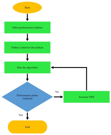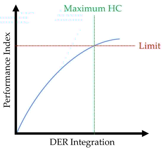 To overcome the challenges of DERs integration, it is important to calculate how much distributed generation (DG) can be integrated into a given distribution network without violating the distribution network’s operational criteria (thermal, voltage/power quality, protection, and reliability). This is called Hosting Capacity (HC), which is defined as the amount of distributed energy resources that can be incorporated into a given distribution network while keeping its performance within an acceptable range and without making any modifications to the existing power system infrastructure [13,14]. The concept of HC was introduced by André Even to identify the effects of high DER integration into the power distribution network [11,15,16]. The concept was later developed by Math Bollen and Fainan Hassan who defined the HC as the maximum penetration level of DER beyond which the performance of the power system becomes intolerable [11,16]. The advantage of the HC concept is that it is “specific, measurable and practical” because it evaluates the acceptable DER penetration level based on well-defined performance limits [11]. The concept of HC is illustrated in Figure 1. There are many factors that limit the HC of a given distribution network. Some of these factors are related to the operational standards while others are related to the physical limits of the various components in distribution networks, such as bus overvoltage, thermal overload, power loss, etc. Several studies are present in the literature that calculate the HC of distribution networks based on various limiting factors and using various techniques [17,18,19,20,21,22,23,24,25,26,27,28,29,30,31,32,33,34,35,36,37,38,39,40,41,42,43,44,45,46,47,48,49,50,51,52,53,54,55,56,57,58,59,60,61,62,63,64,65,66,67,68,69,70,71,72,73,74,75,76,77]. These studies used a wide variety of techniques to calculate the HC.