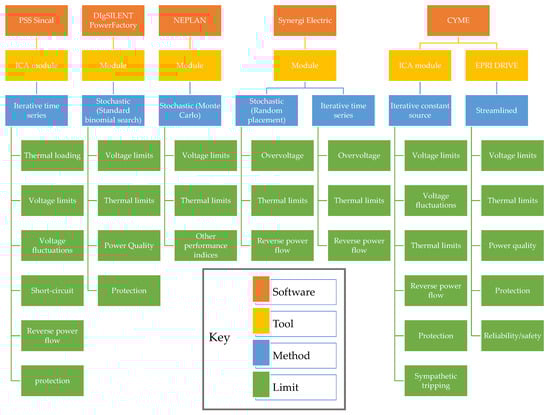 The NEPLAN power system analysis software can be used for network planning, simulation, optimization and analysis. It offers a module which uses the stochastic method for the calculation of the distribution network HC [82]. The stochastic method used is the Monte Carlo simulation with a pre-filter of possible sizes to limit the search space for realistic worst-case values. In addition to modeling DGs, the software can model EVs as well. The limiting factors considered are voltage violation, overloading and other performance indices.