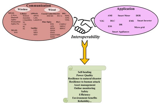 The necessity of providing stable, safe, reliable, and cost-effective services revolutionized the conventional power grid to the smart grid, introducing the next generation of power grid that follows the bidirectional flow of current and the information structure [,,]. High penetration of RES has intensified smart grid development due to the reduction of dependency on finite fossil-fuel resources and their nature-based characteristics [,]. The Supervisory Control and Data Acquisition (SCADA) system holds the responsibility of monitoring and controlling the power system before the advent of the smart grid. This system monitors the electricity network, detects faults based on the acquisition of data from on-site sensors, and controls the network by Power Line Carrier (PLC) as an interface. The main disadvantage of this system is the lack of real-time characteristics []. The appearance of the smart grid, which includes a large amount of actors and applications, has made it a challenge for the power grid to recognize equilibrium among application, communication, and interoperability. Overcoming this challenge is necessary to achieve advantages of the intelligent grid, which Figure 1 visualizes.