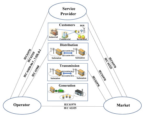 During the recent era, many new concepts such as RES, the smart grid, Energy Storage Systems (ESS), Electric Vehicles (EV), and the electricity market have been exposed to power electric networks []. The necessity of monitoring and controlling power networks revolutionized the one-directional power grid to a bidirectional grid for both power and information flow called the smart grid [,,]. Growing electricity consumption and fossil-fuel burning drive ever-increasing global warming and environmental pollution, introducing RES as an emission-free and endless supply []. Since ESS can compensate for the absence in the duration of nature-based resources, it is applied in the power system to overcome the intermittent nature of RES []. The other outcome of RES is prosumer, which means a power grid customer in the smart grid can not only be a consumer but also be a producer by selling their electricity production surplus to the grid. This outcome requires the electricity market to offer electricity prices to stockholders []. A robust communication infrastructure requires the coordination and integration of heterogeneous smart grid elements [,]. The endeavor to find a common language in this complex environment could publish a plethora of standards and protocols. In 1964, the formation of Technical Committee 57 Working group in IEC was the first attempt to define a standard for telecommunication in the power system [,]. Commonly used protocols, i.e., the Profibus, Modbus, Distributed Network Protocol 3 (DNP3), and IEC 60870, are serial communication and Substation Automation Systems (SAS) that suffer from low response time for real-time communications [,]. Additionally, being a vendor-oriented solution and not a comprehensive roadmap is another problem that causes legacy protocols not to be interoperable with other systems [,]. Although legacy protocols were embedded inside the Transmission Control Protocol (TCP)/IP, during following years, the IEC 61850 standard was developed in 2003 based on the Utility Communications Architecture 2.0 (UCA2.0) to overcome weak points of the legacy protocols. The second edition of the standard was published in 2007 since communication between substation to substation, and substation to control center were neglected in the previous edition. This edition extended its scope to all power automation, including the micro grid, EVs, and distribution automation, and was not limited to substation automation as in the first edition. Hence, IEC 61850 not only overcame the limitations of its predecessor, but also reflected fast development in technology, especially the communication aspect, split data definition aspect, and the methods of exchanging data to cope with the diversity of communication solutions required by the new targeted domains, while keeping the same data model []. IEC 61850 protocol uses client–server communication based on the IEC 61850-8-1 that is mapped on MMS, which is applicable in LAN []. Since RES has slowly become dedicated elements of the power grid, IEC 61850-7-420 and IEC 61850-90-7, which specify information models for Distributed Energy Resources (DER), have been published as new parts of the standard [,]. Moreover, the sizeable number of sensors and actuators are applied to the power grid in the form of Intelligent Electronic Devices (IED), such as switchgears, reclosers, breakers, Phasor Measurement Units (PMU), and smart meters.