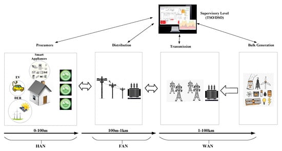 The success of real-time interaction among power system elements as the leading smart grid mission depends on the implementation of a secure, robust, reliable, scalable, integrated, interoperable, and ubiquitous communication systems []. Figure 3 shows the communication network in the smart grid that is classified into three domains, including Home Area Network (HAN), Field Area Network (FAN), and WAN []. HAN embraces the customer side, including home appliances, DER, and EV, and requires applications such as Home Energy Management System (HEMS), V2G, and smart inverters.