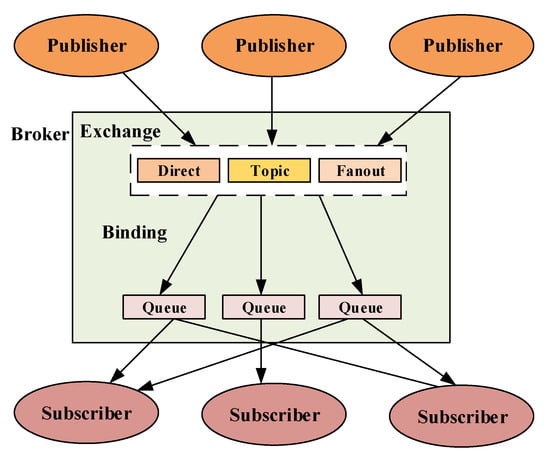 AMQP is an open standard publish–subscribe protocol architecture introduced in 2003 and standardized later by the Organization for the Advancement of Structured Information Standards (OASIS) in 2011. Displayed in Figure 4, Exchange, Queue, and Binding are the three elements that establish the transfer of messages in this protocol. Exchange, which is the broker of this protocol, sends messages to a queue based on their priorities. Binding defines priority with different methods, including direct, topic, and fanout. Transport Layer Security (TLS) offers the security of transmission in this protocol. AMQP is not a lightweight protocol and, in the case of memory, bandwidth, and power, it cannot support standalone sensors [].