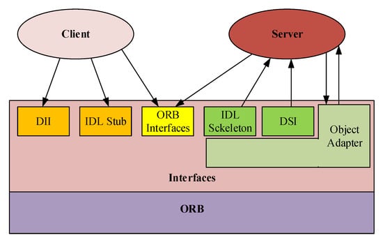 CORBA is a middleware defined by the Object Management Group (OMG) to facilitate the dedicated language and the platform-free interconnection of distributed objects. Objects in this protocol can be clients or servers communicating through Object Request Broker (ORB). According to Figure 5, ORB, which is the core of the CORBA model, has several interfaces defined in the Interface Definition Language (IDL) or located in the interface repository service. While the client sends a request by Dynamic Invocation Interface (DII), IDL stubs, or ORB interfaces, the server receives requests through Dynamic Skeleton Interface (DSI) and IDL Skeleton. An object adapter, another interface between the ORB and server, is responsible for mapping object references in ORB to the corresponding object in the server.