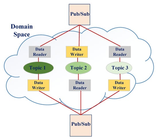 DDS is an open standard middleware designed by OMG that provides real-time communication through the publish–subscribe message pattern. DDS derives a benefit of no longer needing participants to know each other from applying discovery methods, including the Data Centric Publisher Subscriber (DCPS) discovery method or Real-Time Publisher Subscriber (RTPS). Therefore, DDS is a brokerless information exchange protocol without the risk of bottleneck failure. According to the concept of DCPS revealed in Figure 6, there is a domain space in which all applications can interact through that, and all communication entities are placed in the domain. Domain participants are including Data Reader, Data Writer, Publisher, and Subscriber. Participants have access to data based on domain topic and type.