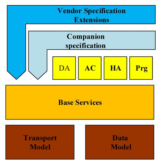 OPC is a result of the automation industry’s cooperation in providing a device’s information for application without access to the device model and performance based on the Microsoft component object model in 1994. The purpose of OPC is to maintain interoperability with other operational systems by a unified architecture called OPC UA. This protocol was standardized by IEC 62541 with a client–server architecture. As shown in Figure 7, OPC UA has two backbones in its architecture, i.e., the transport model and the data model. While servers communicate with clients by two different kinds of transportation, including binary called UA native, or Simple Object Access Protocol (SOAP)/HTTP which calls the UV web services over TCP/IP, the data model determines guidelines for servers on how to depict objects, including variables and methods, through an address space to clients. The base service layer provides services in exchange for information. This protocol information model, including Data Access (DA), Alarms and Conditions (AC), Historical data Access (HA), and Programs (PRG), can be adopted with information models of other organizations, such as the IEC and the International Society of Automation (ISA), or with the information models of vendors [,,].