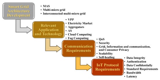 IoT is a technology, which aids the smart grid to collect, monitor, and analyze power grid status and performance, as well as issue control signals [,,]. In 2018, IEC 61850-8-2, a new mapping of information based on XMPP was published to support the integration of the smart grid and IoT, which requires communication in WAN []. However, smart grid communication requires different characteristics, including latency, jittery, bandwidth, and security, based on applications. A large number of other protocols have been nominated for communication in the smart grid over a public network in the literature. The most prominent ones are Common Object Request Broker Architecture (CORBA), Open Platform Communications United Architecture (OPC UA), Data Distribution Services (DDS), Message Queue Telemetry Transport (MQTT), Constrained Application Protocol (CoAP), Advanced Message Queuing Protocol (AMQP), and Zero Message Queue (ZeroMQ), all of which can be investigated based on their features in the smart grid and their pros and cons to facilitate the smart grid application communication requirements.