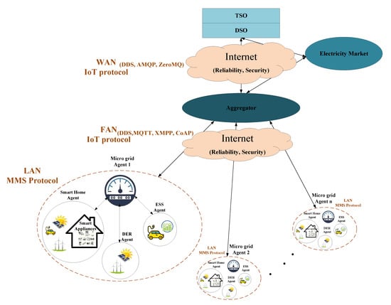 The smart grid communication architecture, which is shown in Figure 3, has three levels, i.e., HAN, FAN, and WAN that map to those standards and the MAS architecture in Figure 9. This figure delineates the MAS architecture of the smart grid. It also provides a guideline to find a proper IoT protocol for communication at each level of this structure. The communication structure inside each agent is on top of LAN and in accordance with MMS protocol based on IEC 61850. In this architecture, a multi-micro grid, entities can communicate with the supervisory level, such as DSO/TSO, through aggregators. Aggregators are placed in the middle of this architecture to facilitate interaction and cooperation and ensures data management, bundling, matching, and transaction among the micro grid, electricity market, and DSO/TSO. Since we consider economical constraints to provide communication structure, it is recommended to avoid dedicated ones and using existing infrastructure, which is the Internet. Communication exchanged aggregator and micro grid agent happens over the FAN, and IoT protocols recommendations, according to the previous section’s investigation for this level are MQTT, CoAP, and XMPP. AMQP and ZeroMQ are suitable protocols applied for communication between the aggregator and the supervisory level. DDS is a robust and mature protocol that can be used in WAN. This protocol takes advantage of free infrastructure by using the Internet. It supports a wide variety of QoS, such as security and reliability, which are essential characteristics that we need for communication through the Internet.