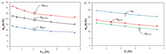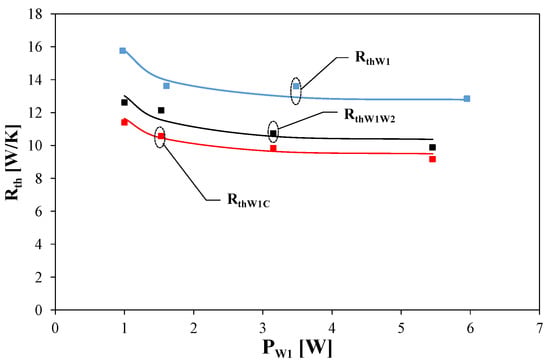 For example, by means of Equation (2), the measured (indicated by points) and modelled (indicated by lines) dependences of thermal resistances in the thermal model of the transformer on the power dissipated in one of the components of the transformer are shown in