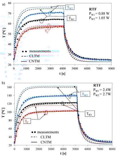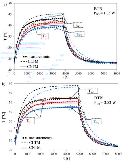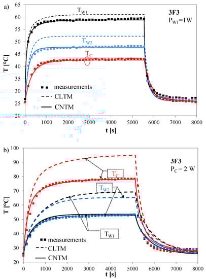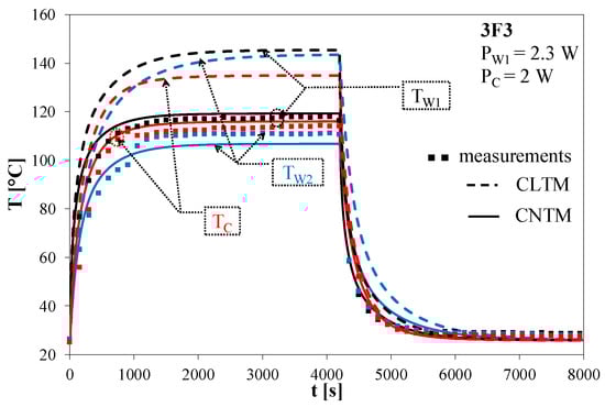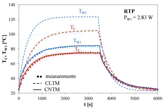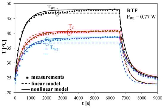 Figure 9, it can be observed that the results of calculations performed by means of the nonlinear thermal model assured better agreement with the results of measurements than the results of calculations obtained by means of the model described in [