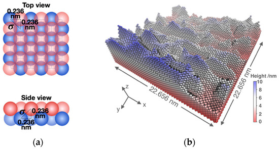 We constructed a model surface using spherical beads of diameter σ = 0.33 nm, initially arranged on an FCC lattice to create a square-based slab exposing the {001} plane, as indicated in Figure 2a. Beads were then removed from the top surface to match the topology of the selected region of the Ketton sample shown in Figure 1c. Figure 2b shows the resulting model surface; here, the color bar indicates the elevation of individual beads.