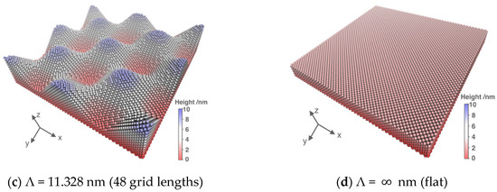Examples of four (a–d) sinusoidal surfaces with a 4-nm amplitude and wavelength (Λ) from 1.416 nm to infinity. These surfaces have the same base area as the surface in Figure 2b. The wavelength range includes the wavelengths of Figure 2b characterized using Fourier transform. The color of the beads indicates their elevations (in nm) in the z-direction. Other examples are provided in the Supplementary Material.