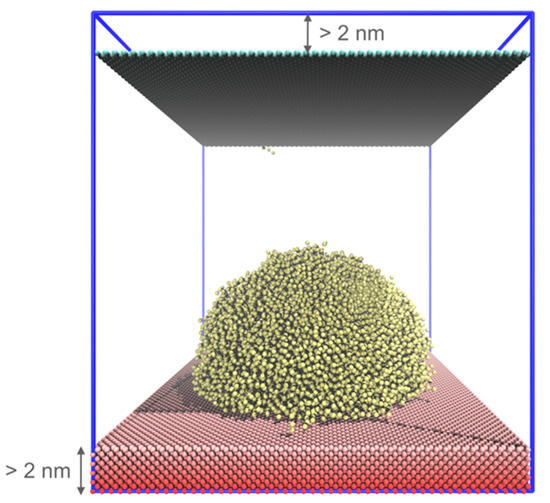 We carried out MD simulations using GROMACS 2018 [90]. Initializing the simulations, a fixed number of fluid molecules were arranged in a cubic geometry in the middle of the simulation box. The solid surface (the surface with Ketton topography in Figure 2b or one of the eight sinusoidal surfaces detailed in Table 1) was placed at the bottom of the box. The lateral (x and y) dimensions of the surfaces were 22.656 nm × 22.656 nm in all cases. A wall (one bead thick) was placed at the top of the simulation box (illustrated in Figure 4) to prevent the escape of fluid molecules. The fluid-barrier potential was modelled explicitly using an effective pseudo hard wall potential [91], which has no influence on the fluid–solid interactions. Note that the hard wall was positioned 2 nm below the top of the box to ensure there were no interactions between the wall and the surface replica, since periodic boundary conditions are present in all three Cartesian directions. We chose a long cut-off distance (2 nm) to eliminate the need for long-range corrections of the pressure and energy. Upon setting up the simulation box, the system was run for 2.5 ns with a 5-fs time step in the canonical (NVT) ensemble at a temperature of 298.15 K, controlled by the Nosé-Hoover thermostat using a 2-ps time constant. During the simulation, the fluid gradually forms a spherical drop and spontaneously moves towards and then contacts the surface. No gravity or external forces are employed; the adsorption on the surface is a consequence of free energy minimization. A further 5 ns of simulation was carried out to ensure the system had reached equilibrium, indicated by the flattening of the potential energy curves. The liquid n-decane drop was in equilibrium with coexisting vapor, but at the temperature studied, the vapor pressure was only about 7800 Pa and the number and effect of the vapor-phase molecules on the liquid droplet were negligible. Figure 4 illustrates the geometry of the simulation box and an equilibrium configuration in the case of a flat surface.