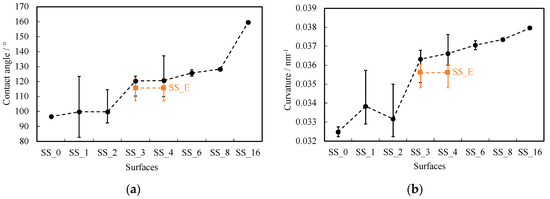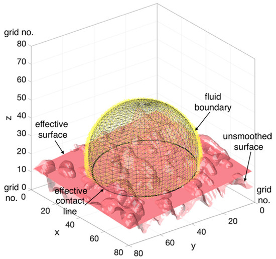 After segmenting and cleaning the fluid density image, a spherical cap was fitted to the liquid–vapor interface by minimizing the squared error between the spherical volume to the segmented droplet volume employing a MATLAB [92] script. Near the solid interface, the droplet’s shape locally deviated from a sphere. As these local deviations were found to disturb the fitting of the global droplet shape, fluid voxels near the solid surface (<2 voxels distance) were not taken into account for the least-squares algorithm. An example output of the fitting procedure is shown in Figure 5 for the example of the model surface with natural roughness, SS_E. The apparent contact angle was determined by computing the angle between the fitted spherical cap and an effective flat surface, which averaged out the rugosity. Another wetting metric that can be obtained here includes the curvature, which is given by the inverse of the radius of the fitted spherical cap. Alternative procedures for evaluating the contact angles have been presented before in the literature [55,62,93,94].
