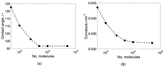 The dependence of the computed contact angle and curvature on the size of the droplet was tested by considering six scenarios with 500, 1000, 2500, 5000, 10,000, and 50,000 fluid molecules in the simulation. Figure 6 shows how the contact angle and curvature change with respect to the number of fluid molecules simulated.