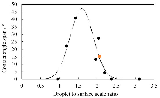 We investigated the contact angle span (uncertainty) by plotting it against the droplet to surface scale ratio in Figure 8. The surface scale was measured from the highest point of a sinusoidal surface to the bottom of its sinusoidal feature, i.e., the amplitude, which was fixed at 4 nm. The scale of the droplet was defined as the distance from the center of the fitted sphere (shown as the mashed sphere in Figure 5) to the bottom of the sinusoidal feature of the surface. As can be seen in Figure 8, the contact angle variation first increases then reduces, following a Gaussian curve. Hence, one may argue that the effect could be eliminated when the scale of the fluid drop is 2.5–3 times greater than the scale of the surface feature. Therefore, if a much larger fluid drop is used, say 10 times greater than the current droplet, the error bars may be reduced significantly.