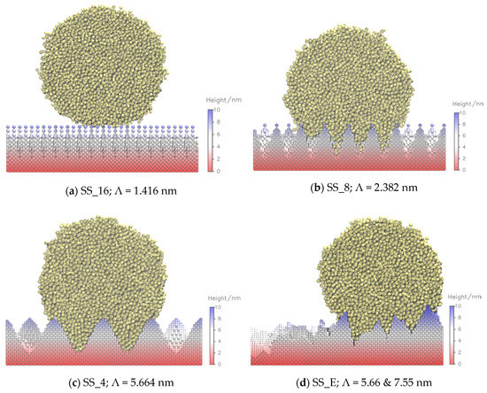 where is the equilibrium contact angle formed on a flat surface. Over a less rugose surface, i.e., Figure 9b, gaps are filled by fluid molecules, and a vapor phase exists between sine asperities. is large in this case, making greater than as observed from Table 1. The range from SS_8 to SS_16 corresponds to the so-called capillary drying effect, where the contact angle increases significantly relative to the angle obtained with the flat surface. The contact angle of the realistic surface (SS_E) is 120°, which is well captured by the surrogate surfaces SS_3 and SS_4. Figure 9c,d display the section of equilibrated fluid on SS_4 and SS_E surfaces, respectively, where the fluid has filled the surface gaps and the system seems to be entering the Wenzel state.