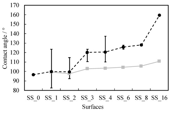 Figure 10 shows the system no longer follows Wenzel’s prediction as early as SS_3 using the simulated contact angle value of 97°, on the flat surface SS_0 as .