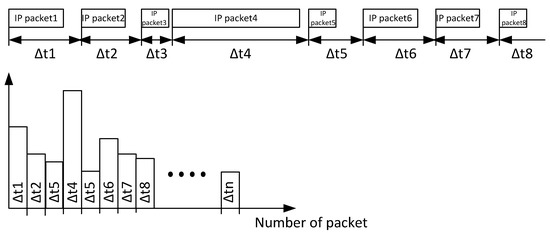 Thus, when additional requests appear on the network, the time between packets will decrease. Since the traffic is recorded in both directions, then the desired packets will arrive in batches (request-response). Therefore, the detected effect must be set in the form of pulses of negative polarity, short duration and low repetition rates. Taking this data as the source, we will carry out a parallel decomposition of the legitimate traffic (the original network traffic) and the total traffic (with the additive addition of the illegitimate component to the legitimate traffic [23,24,25,26,27,28]).