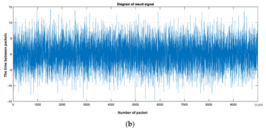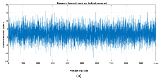 Figure 2a shows a graph of the simulated traffic, where the legitimate component is specified by a generator with a normal distribution, mathematical expectation 2 and dispersion 4, the color of the legitimate component is blue, the illegitimate component of the intended impact is shown in red, pulse duration 2, the mathematical expectation is equal to 5.02 × 10−5, the number of pulses is equal to 2; the width of the analyzed window is equal to 10,000. Figure 2b shows a graph of the obtained additive mixture, estimated relative to the mathematical expectation of the additive mixture.