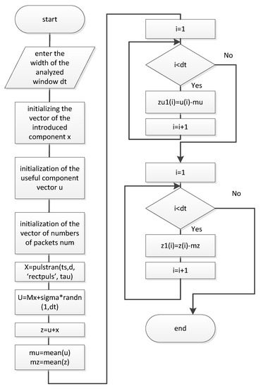 The problem statement is as follows. Let there be some statistics of the network traffic, which is characterized by the mathematical expectation Mx and dispersion D. Some illegitimate component is additively superimposed on this traffic, and this component is characterized by the mathematical expectation MxNoice and dispersion DNoice. This component is a sequence of pulses, the mathematical expectation of which is a fraction of the mathematical expectation of the legitimate traffic. Pulses have a short duration τ and a low repetition rate. It is required to detect an additively superimposed illegitimate component (noise).