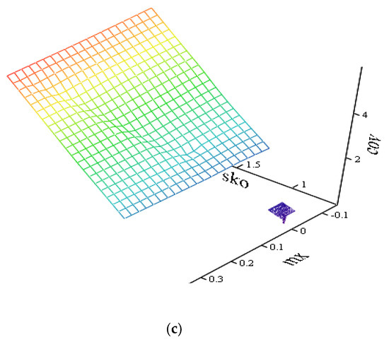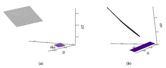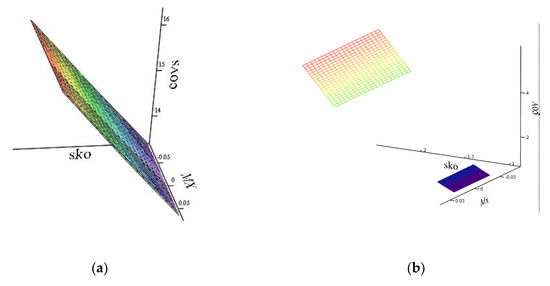 Figure 12a,b are similar in nature to the location of the planes at the iteration in the previous series of experiments. However, the number of iterations has increased to highlight features indicative of the introduction of an illegitimate component. It is also obvious that the plane of values of the component of legitimate traffic at iteration 5 (Figure 12b) has a significantly smaller area with increasing dispersion. That is, with a decrease in the activity of the intruder, as well as with a decrease in the length of packets sent to the network, the model allows one to detect deviations from legitimate traffic and to predict statistical characteristics in the next window of anomalous traffic. These alarms of unauthorized actions in the network will allow one to classify an attack.
