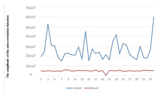 In order to establish a statistical relationship between the obtained extremes of the selected components, the autocorrelation functions of the legitimate and total traffic were analyzed. Figure 7 shows a sample of the amplitude of the autocorrelation function in this series of experiments at the third iteration. Obviously, the ranges of values do not overlap, and the values of the autocorrelation function of legitimate traffic have a greater deviation from the average than the values of the autocorrelation function of the total traffic, which indicates a greater determinism of the selected component of the total traffic.