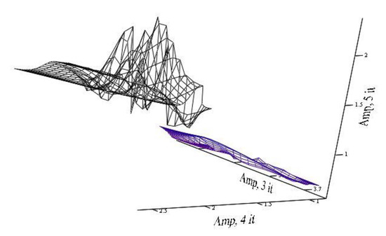 Figure 13 shows the change in the amplitude of the autocorrelation function by iterations. Obviously, when analyzing the selected components according to the results of the decomposition of three iterations (the third, fourth, and fifth iterations), the value planes do not intersect. However, the third iteration is not informative, and the fourth and fifth iterations are visual, and are similar to the previous series of experiments. It was also found that the correlation interval varies similarly to the previous series of experiments, however, the difference between the components of legitimate and illegitimate becomes apparent from the fourth iteration.